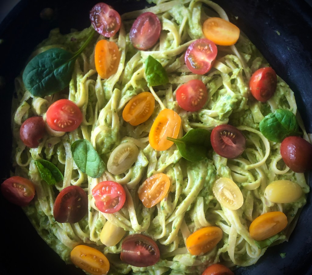 - Mix into pasta. Top with some baby spinach and medley tomatoes. Serve immediately.