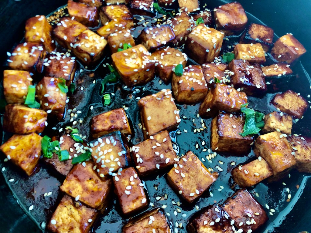 Cut tofu into small bites and marinate overnight with the following: fish sauce, garlic paste, sesame oil, agave or honey, soy sauce and gochujang sauce.