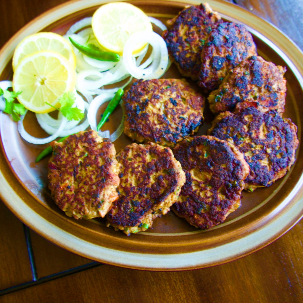 - Heat ghee. Fry the patties 4 at a time. Cook on both sides till done. Serve with lemon slices, onion slices, green chilies and cilantro.