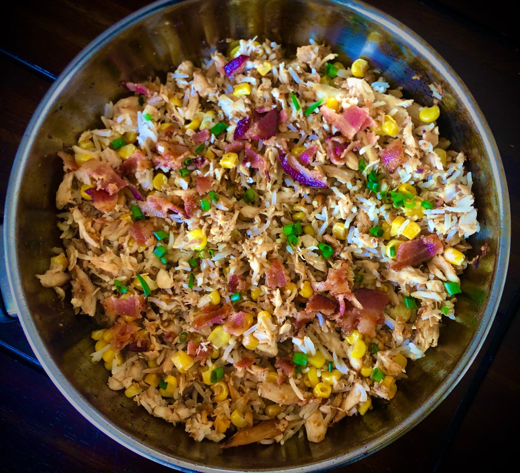 This recipe is all about putting your leftovers to good use- leftover rice, leftover rotisserie chicken and some rashers of bacon come together with a few ingredients from the pantry in this easy weeknight dinner. This is great for both adults and kids. It is a colorful, tasty and easy recipe. @sarchakra
