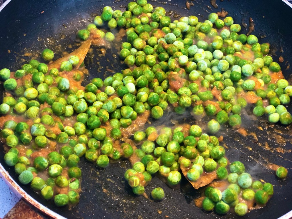 - In the remaining oil, add bay leaf along with ginger and garlic paste. Cook for a couple of minutes. Add turmeric and chopped tomato. Cook on medium heat till the oil floats. Add salt, sugar and peas.