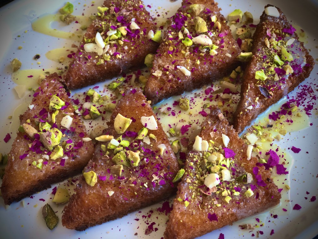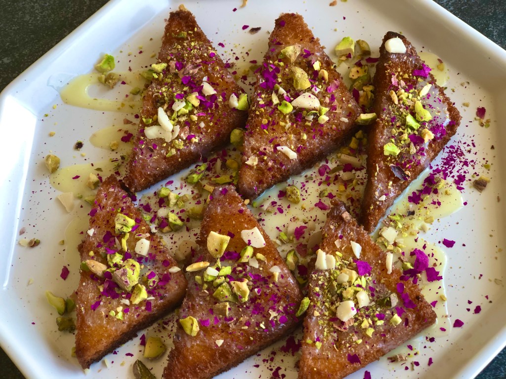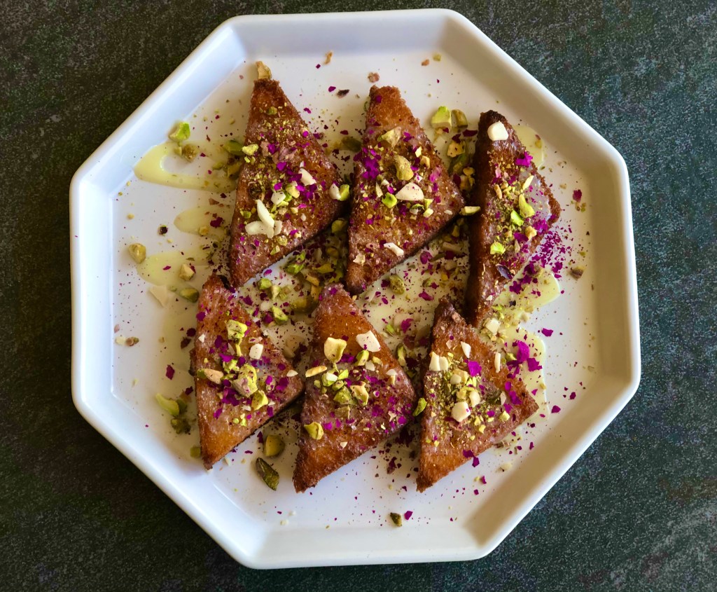I love this recipe. It is a super simplified version of a traditionally long winded dish but still tastes amazing. You can boil milk and spend an hour thickening it (and nothing wrong if you decide to do that) but I do not have a lot of patience when it comes to desserts so this is an easy peasy short cut of a recipe using condensed milk. The addition of pistachios and almonds gives that added crunchiness and the rose petals not only look amazing in terms of presentation, they also taste delicious. I’ve used brioche because I personally like it but any white or milk bread will do. Brown bread will not work quite as well since it is a bit chewy and the whole point of this recipe is that melt-in-your-mouth taste @sarchakra