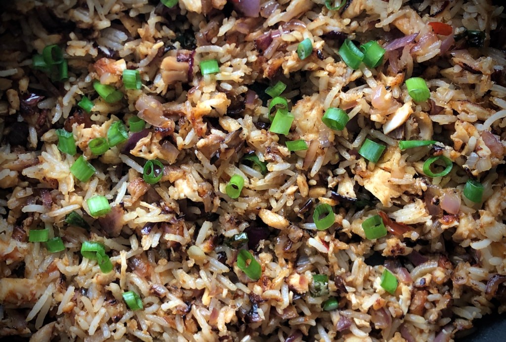 - While that is cooking, heat the cooked rice in the microwave for 30 seconds. Add the rice to the pan along with the garlic and onion. Add the cooked chicken.