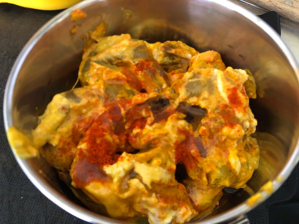 - In a large pan of water heat up water. Gently drop the covered bowl on to the boiling water. Make sure the boiled water does not seep into the lidded bowl. Lower the heat to medium and cover the pan with a lid. Let this cook for 15 mins. Turn off the heat and let it stay in the steam for 10 mins before opening the lid and the cover of the bowl. Serve with cooked basmati rice.