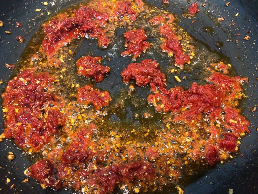- In a pan heat oil. Put in cumin seeds. Sauté for a minute and then add tomato paste. Cook the tomato paste in the oil for a couple of minutes.