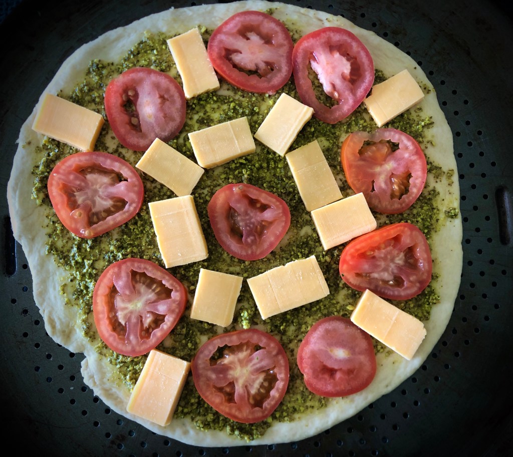 - Spread pizza crust on a pizza pan. Top with pesto, tomato and cheddar rectangles.