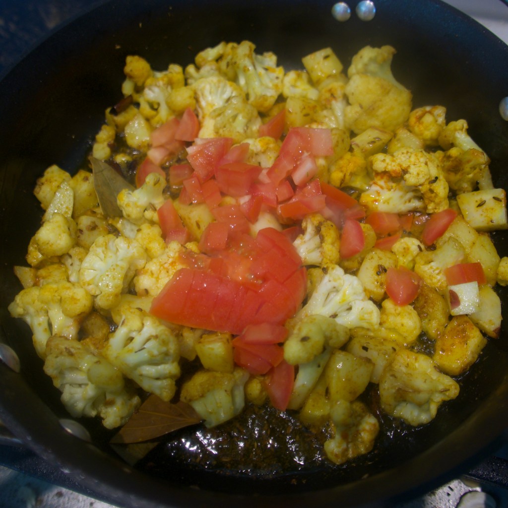 - Add cauliflower and potatoes. Add in salt and turmeric. Sauté for a couple of minute before adding cumin powder, coriander powder, red chili powder.