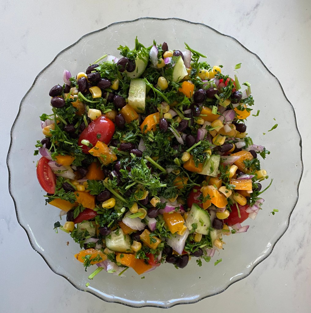 - In a big bowl, put in drained black beans, sweet corn, onions, cherry tomatoes, cucumber, chopped parsley and pepper.
