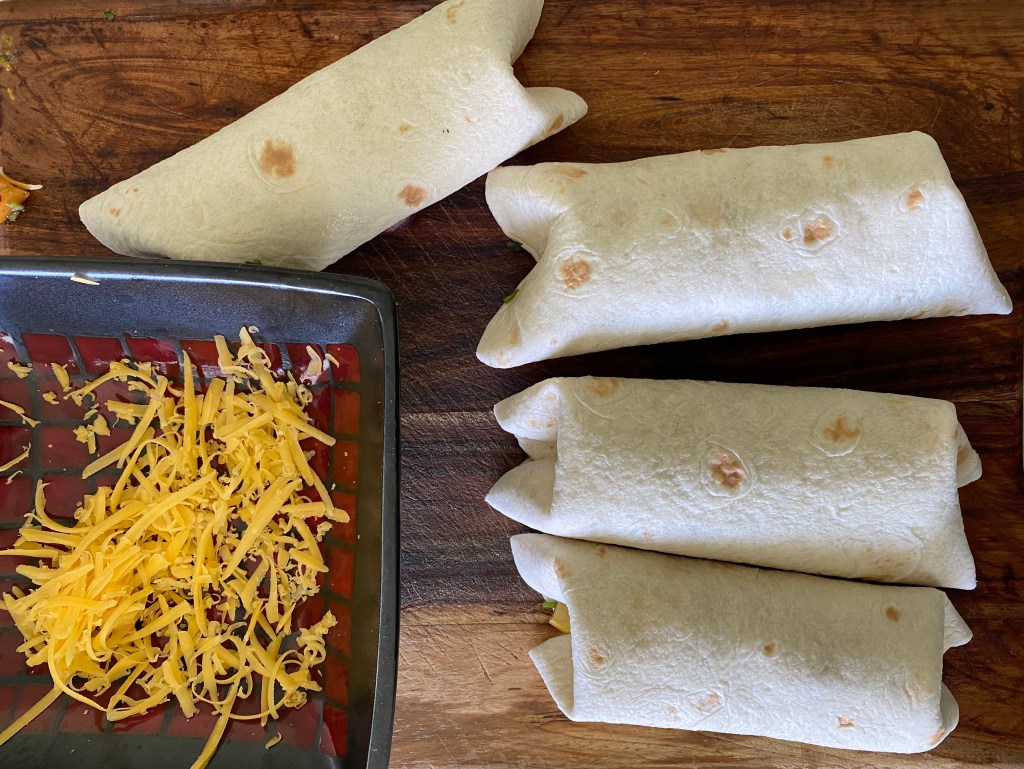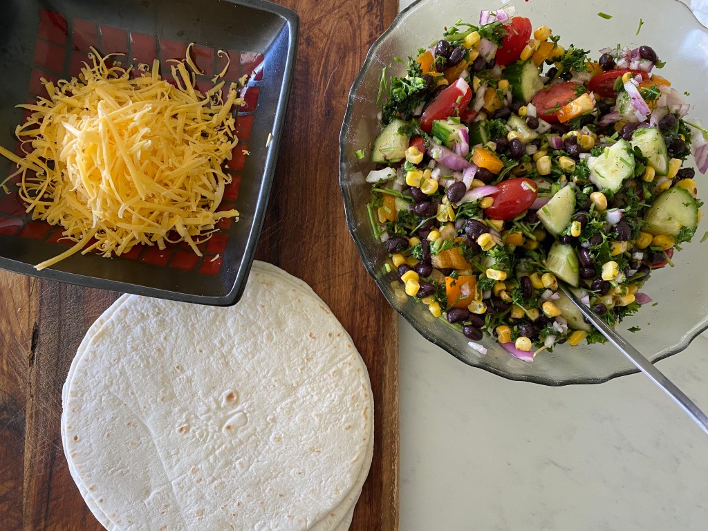 - Put a heap of the salad on each tortilla. Top with grated cheddar.