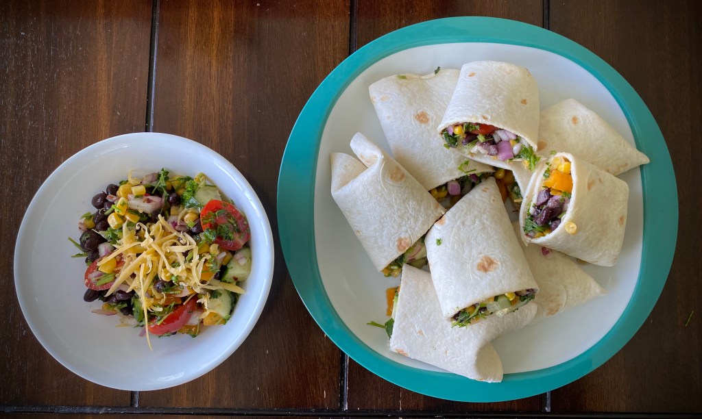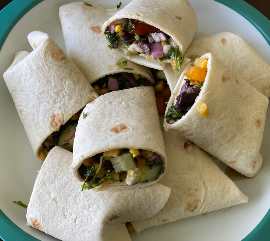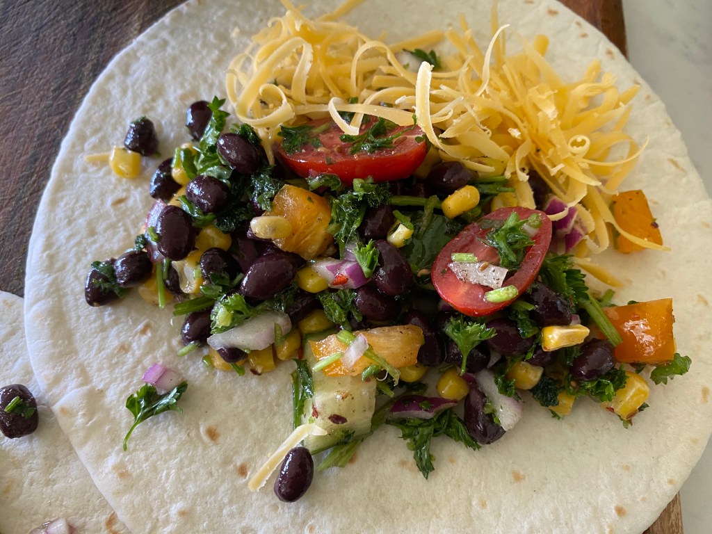 The base for the wrap is this amazing salad with a ton of fresh vegetables and some packed protein with black beans and sweet corn. You could put the wraps in the griddle and cook them till the cheese melts but I like it cold so I can enjoy the freshness of the crunchy vegetables. The salad itself stores well in the fridge as a next day lunch on the go. When making the wraps, if you’re going to eat it cold, it’s best done when you eat it @sarchakra