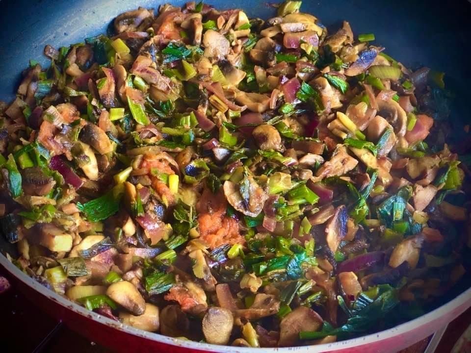 - Add in mushrooms, onions and spring onions. Stir fry for a few mins.