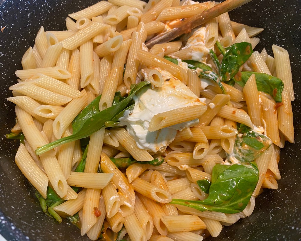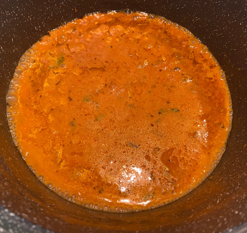 - Add cream. Let it cook for 5 minutes till the oil starts to float. Add the spinach. Let it wilt.