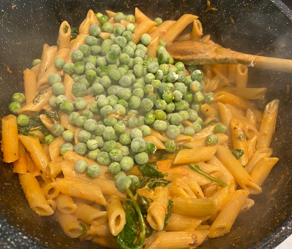 - Season with chipotle chili peppers. Put in the frozen peas. Cook for 2-3 minutes on high heat. Remove from heat once the sauce comes together. Serve.