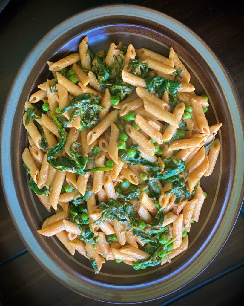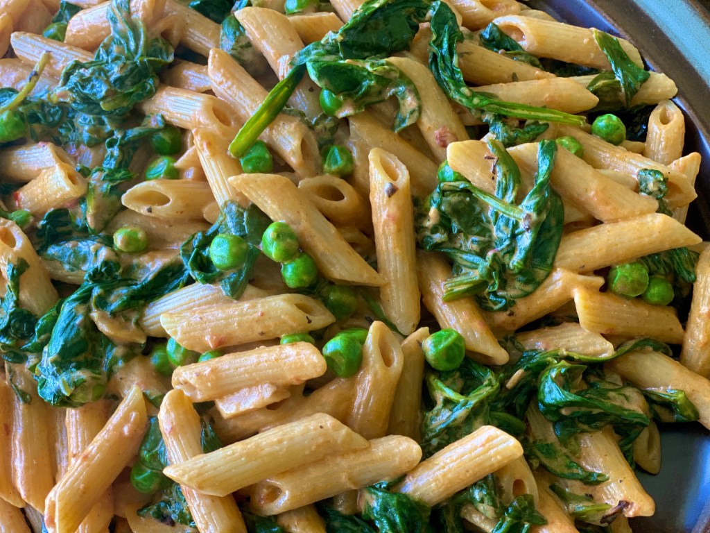 Penne is the plural of the Italian ‘penna’ which comes from the Latin ‘penna’ meaning ‘pen or feather’. So penne pasta is pasta like a pen or quill shape with a sharp nib. The shape of the penne works wonderfully well in retaining the sauces inside its cylinder shape. This creamy spinach and peas penne is ready within minutes and tastes absolutely delicious. I love fire roasted tomatoes. They have a smoky flavor that adds a level of depth to the dish which otherwise using regular tomatoes would not. This easy recipe can be doubled or tripled to feed a large crowd with minimal hassle @sarchakra