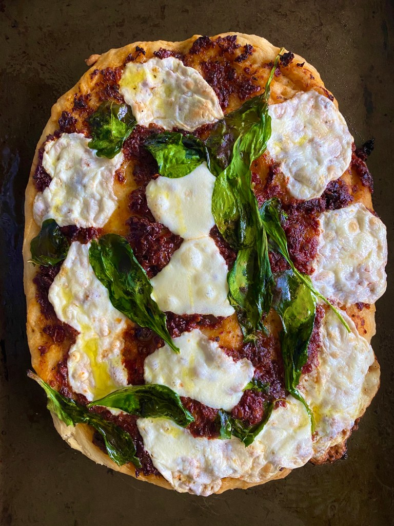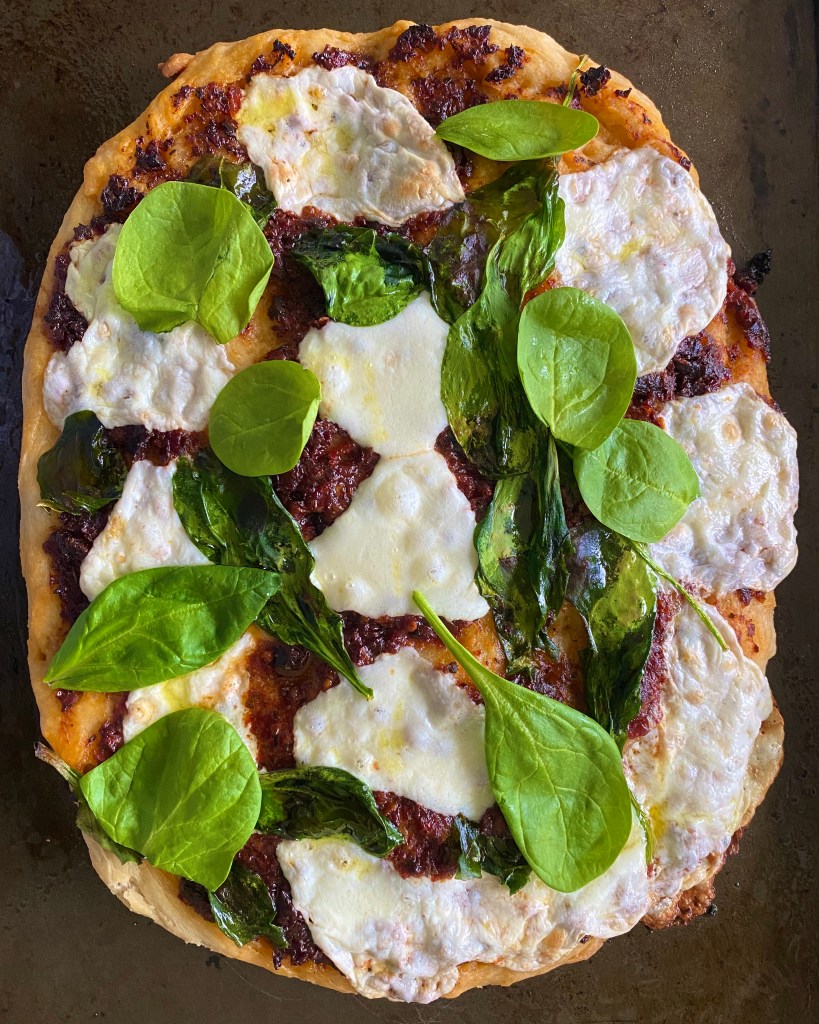 - Spread out sun dried tomato paste on the pizza crust. Top with mozzarella and spinach.