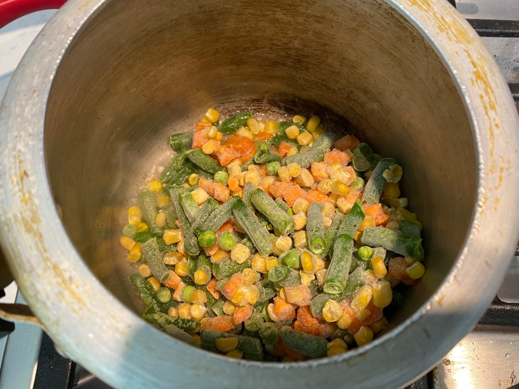 - Heat oil in a pressure cooker. Add the mixed vegetables. Cook for a minute or so.