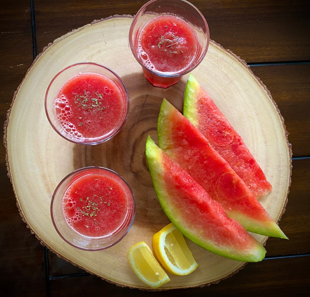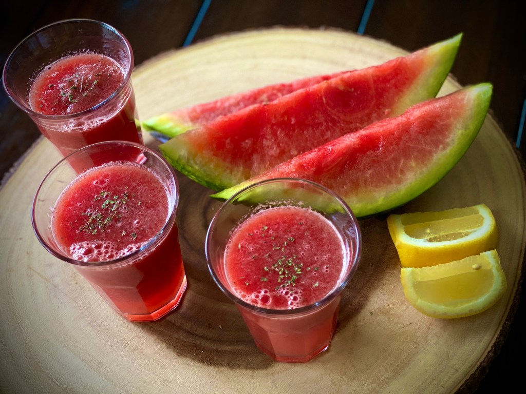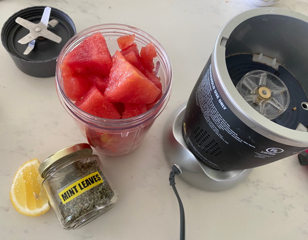 - In a blender blitz together watermelon cubes and 1 tsp dried mint.