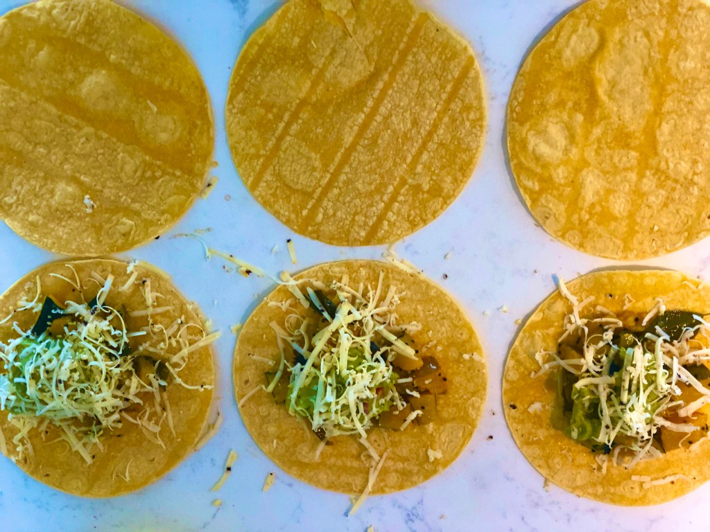 - Heat corn tortillas on a skillet. Remove. In each tortilla put in 1 tbsp of squash, a dollop of avocado and grated cheese.