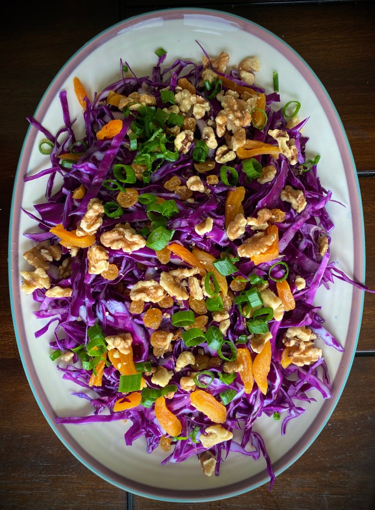 - In a serving plate put red cabbage, golden raisins, dried apricot strips, spring onions and toasted walnuts.