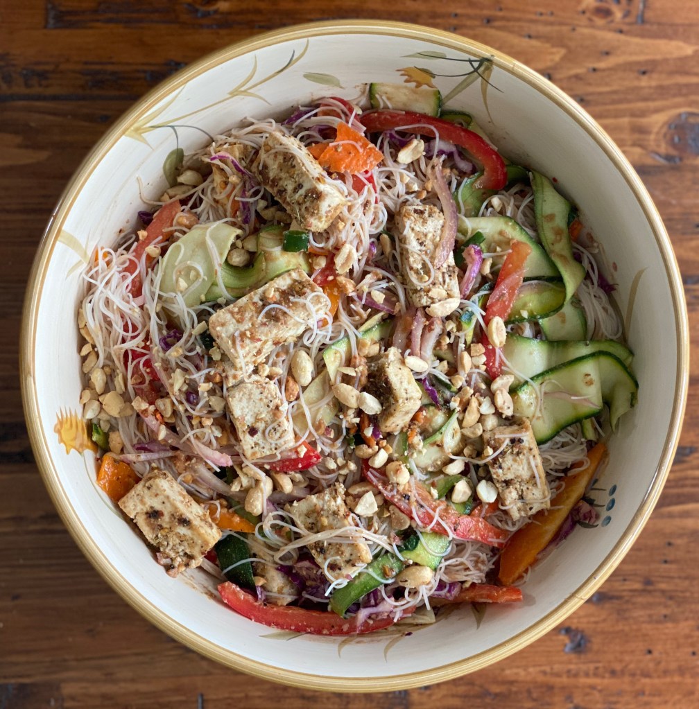 - Pour the dressing over the rice noodles, tofu and vegetables.