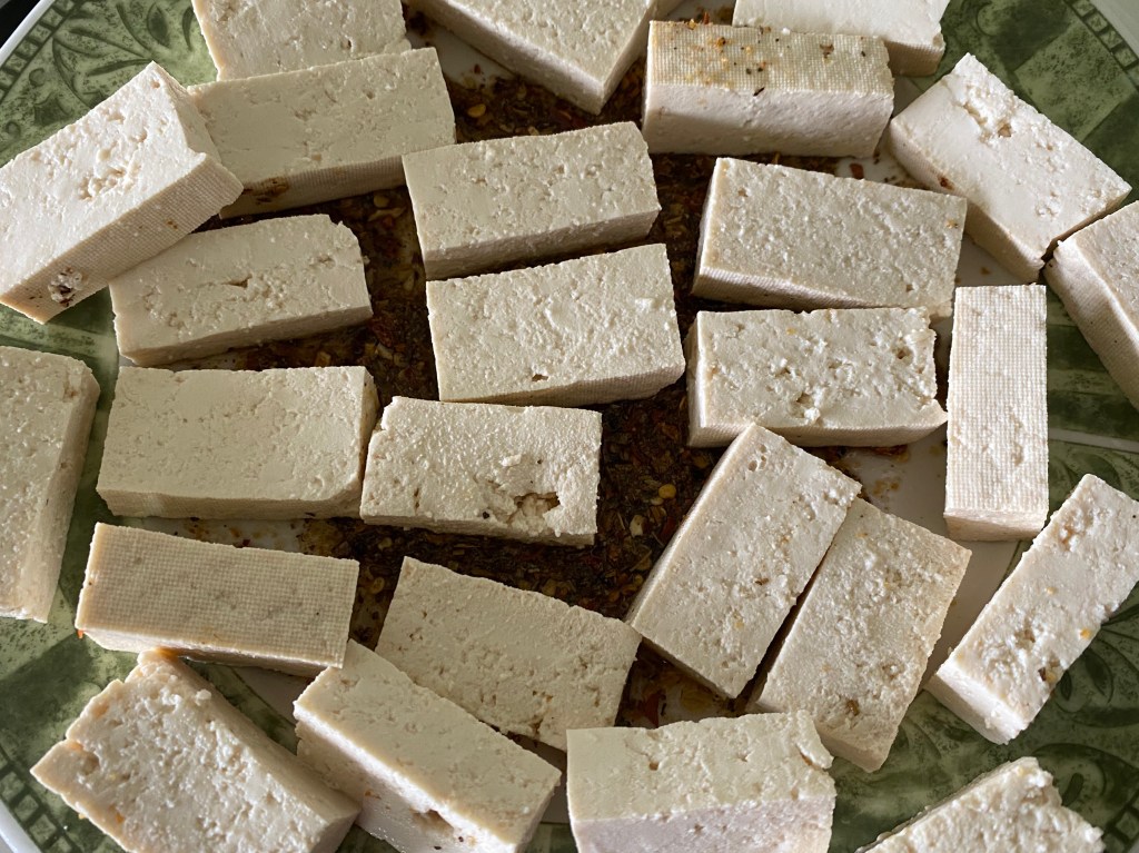- Press put all the water from the tofu using kitchen towels till dry. Cut into rectangles.