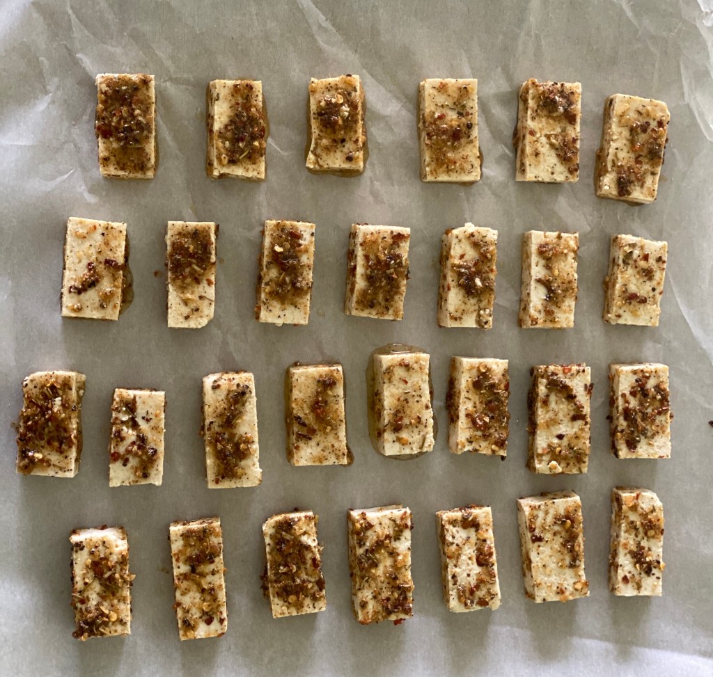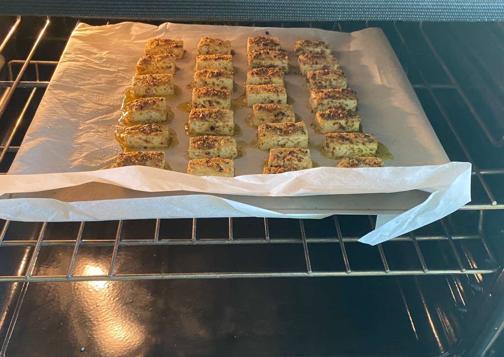- Bake the seasoned tofu for 25 mins. Keep aside.