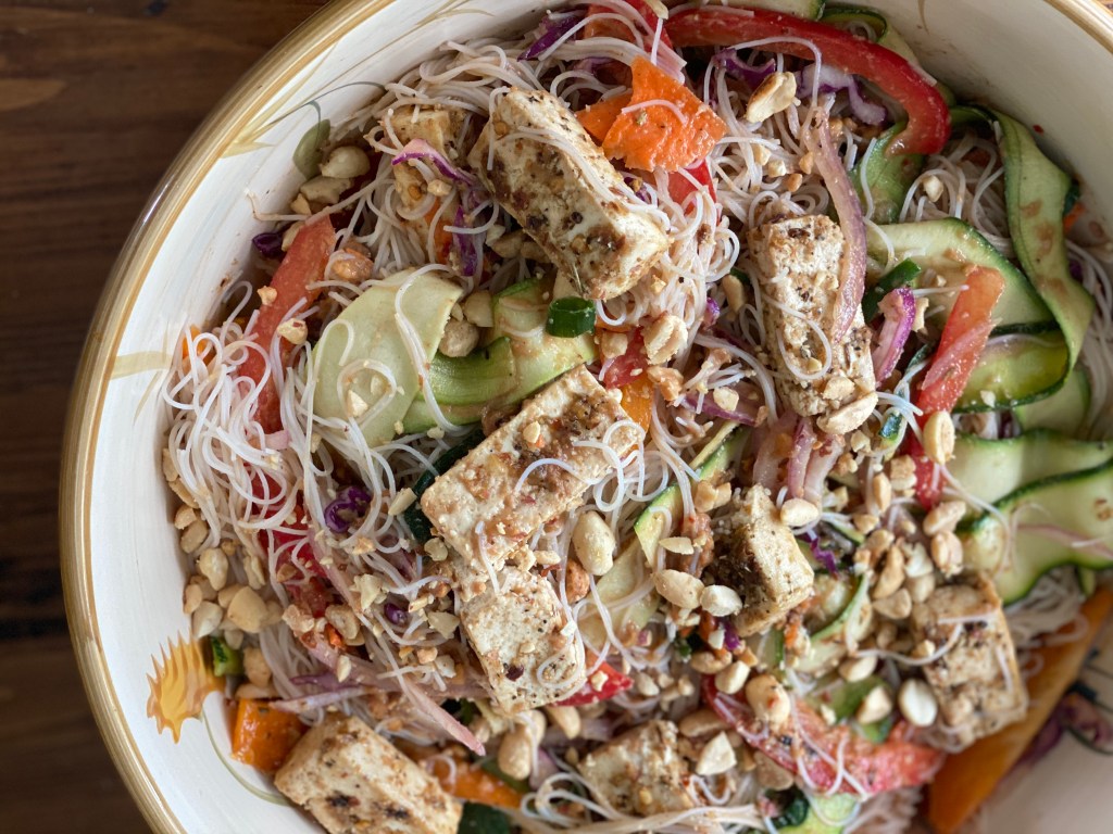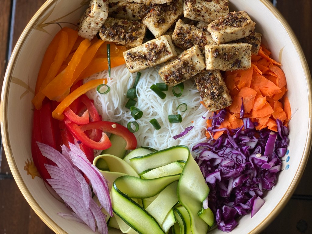 - In a large serving bowl put noodles. Add in sliced onions, red peppers, orange peppers, red cabbage, zucchini strips and carrots. Top with the baked tofu.