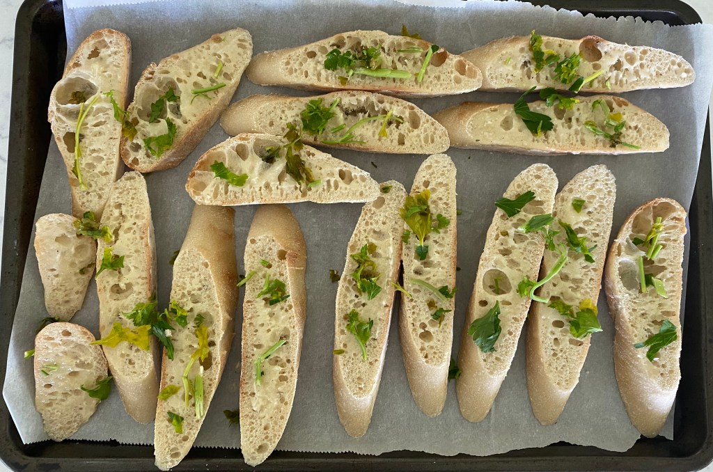 - Brush each baguette slices on both sides with the butter mixture. Top with some chopped parsley.