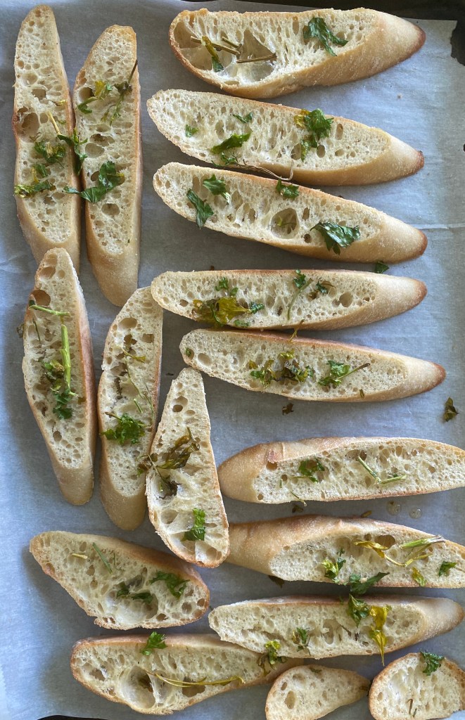 - Place the baguette slices on a tray lined with parchment paper. Cook in the oven for 12 mins or so till slightly golden. Remove. Crostini is ready. Now for the toppings.