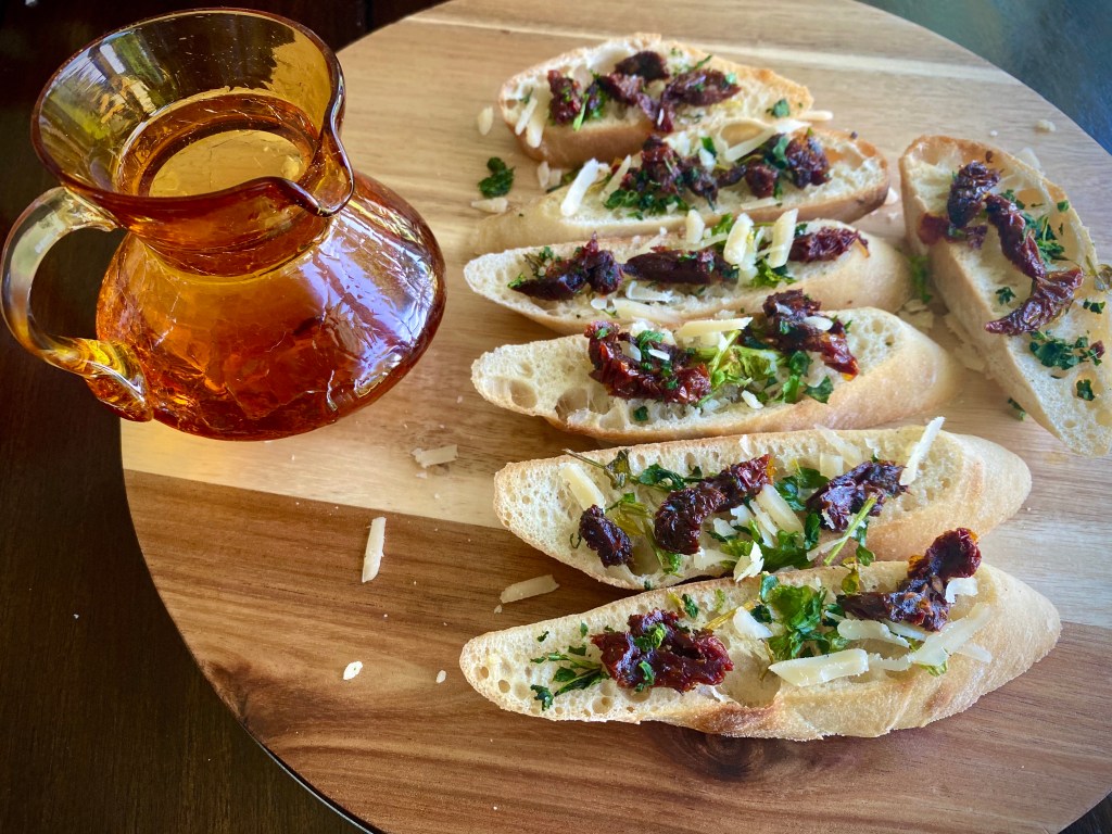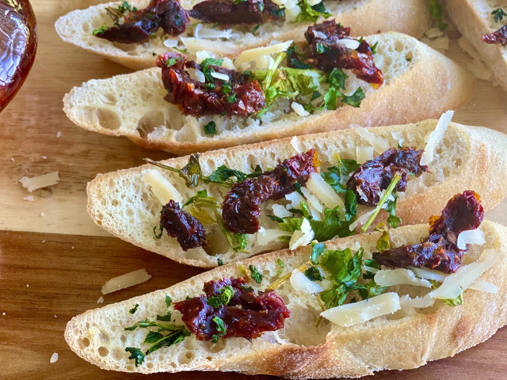 - Top each crostini with chopped sun dried tomatoes, basil and grated fresh Parmesan. Serve with a generous drizzle of extra virgin olive oil.