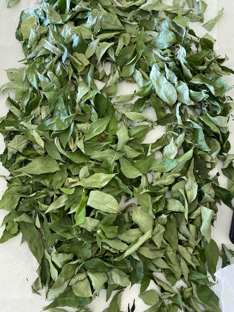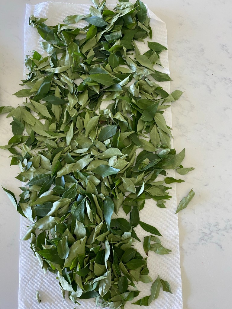 Leave them on the kitchen worktop for a couple of days till it completely dries off. I do not leave it outside because the weather here is not reliable in that sense! From snow to rain to a couple of months of sunshine -that is pretty much Minnesota weather. At least for curry leaves, there is no need for sunshine. Leaving them on the kitchen worktop or a side table works just fine. The texture changes to crispy. Then you know they are ready.