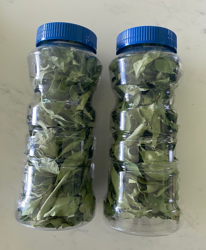 That’s it. When ever a recipe calls for curry leaves just take a few from the container and use it like you would use it fresh. This stays good for months till you finish. I’ve never had any leaves go bad or discolor this way. Happy cooking!