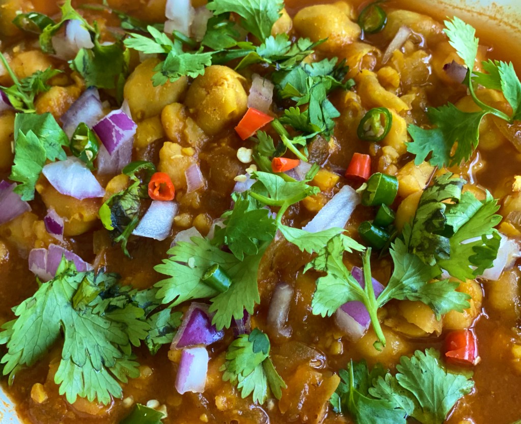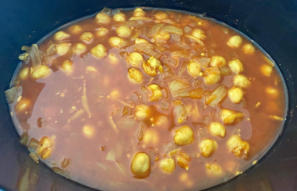 - Set the timer on high for 2 hours. At the end of two hours, using a potato masher gently mash some of the chana to make the gravy a bit thick.