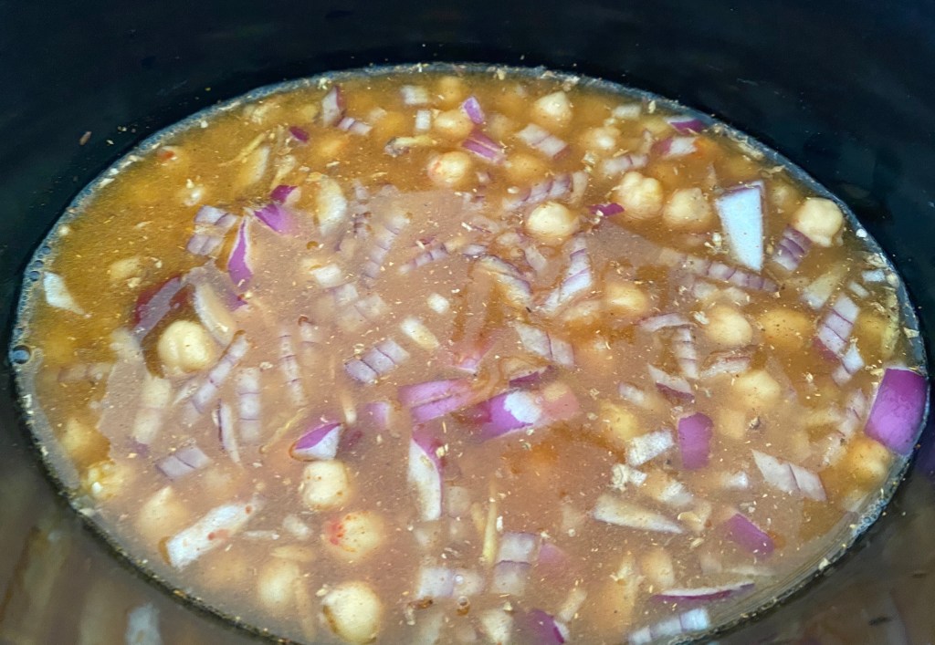 - Put slow cooker on. Put in drained chick peas, chopped onions, tomato paste, Chana masala powder, turmeric, salt, coriander powder, ginger, garlic, cumin powder, red chili powder. Add 1 cup of water. Mix.