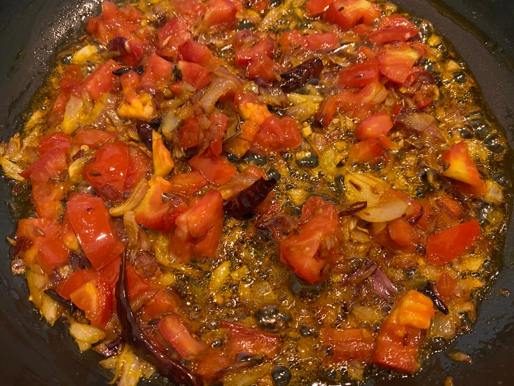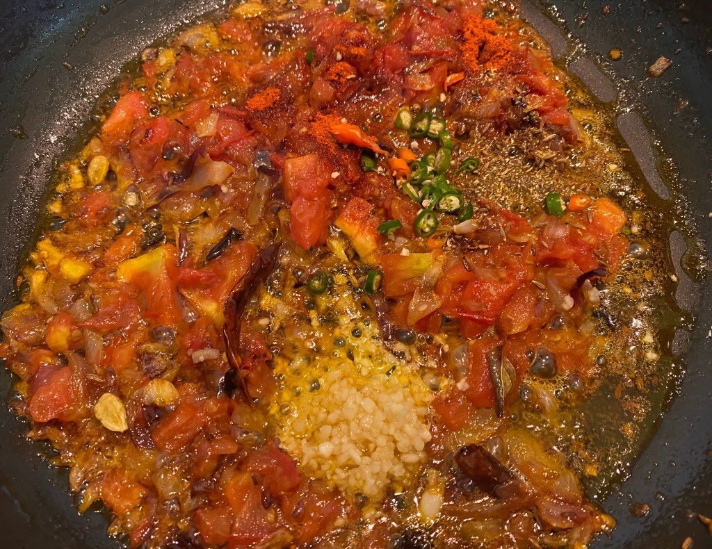 - Add in sliced onions and sauté till slightly caramelized. Add in chopped tomatoes. Add red chili powder, cumin powder and coriander powder. Cook on high. With a masher, gently mash the tomatoes so they mix into the sauce. Add garlic, ginger and chopped green chilies. Let it cook.