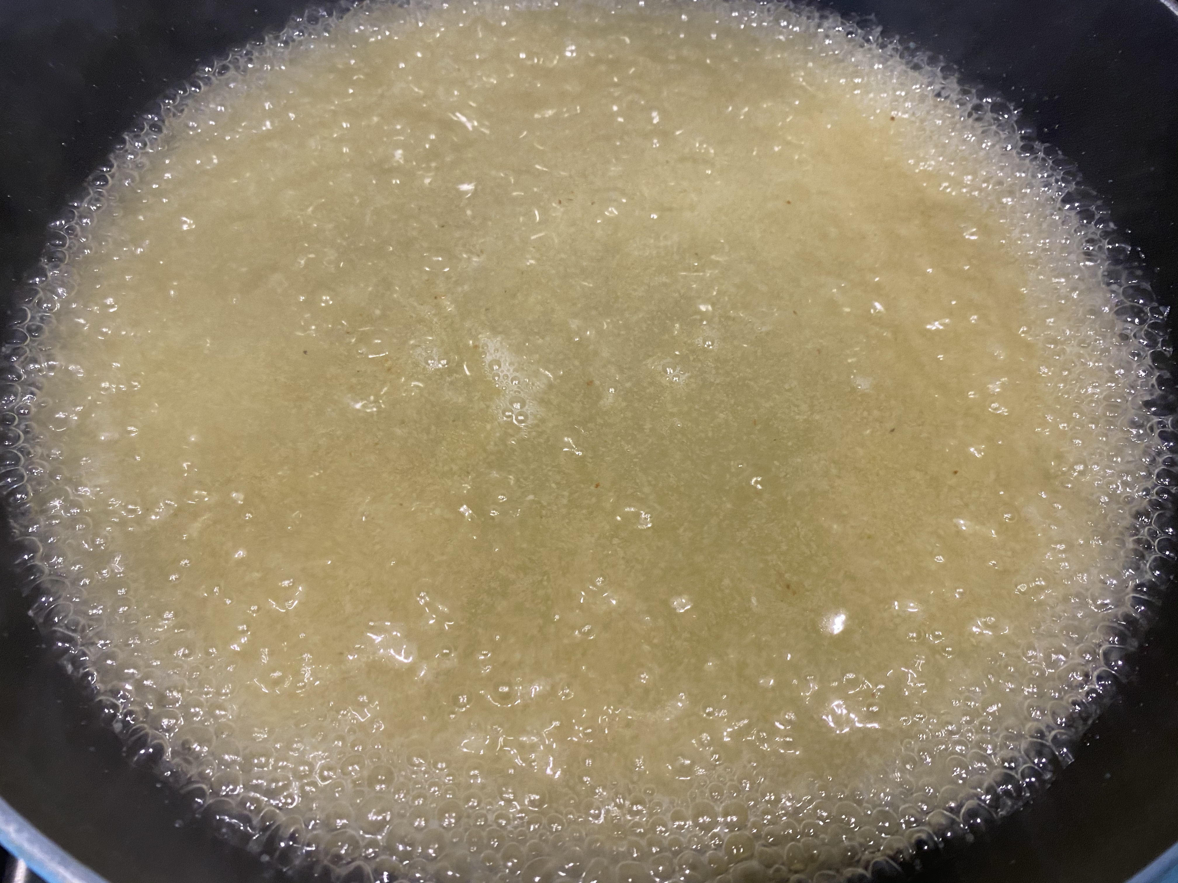 - In a large pan heat water, sugar, green cardamom and a few strands of saffron. Let it come to a boil. Let it come to a simmer while you start on the semolina in another pan.