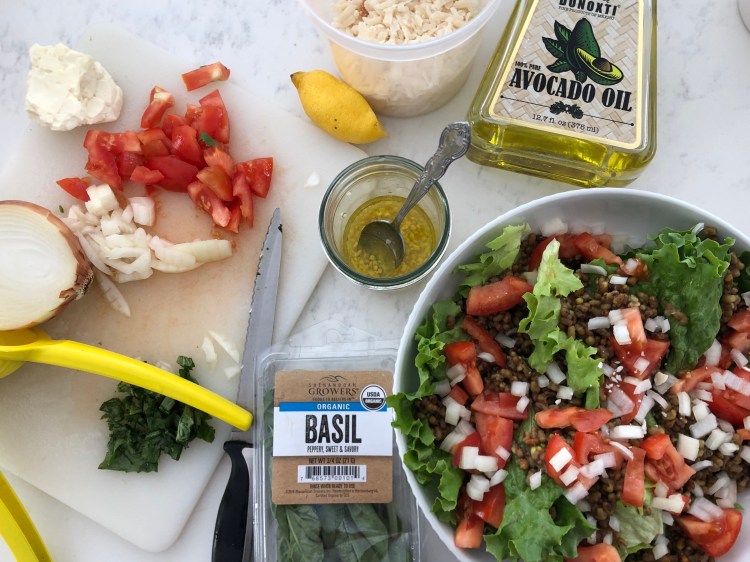 - Place 3-4 leaves of lettuce on the bottom of a large bowl and top with the following: cooked lentils, onion, tomato. Pour dressing on top. Garnish with Parmesan.