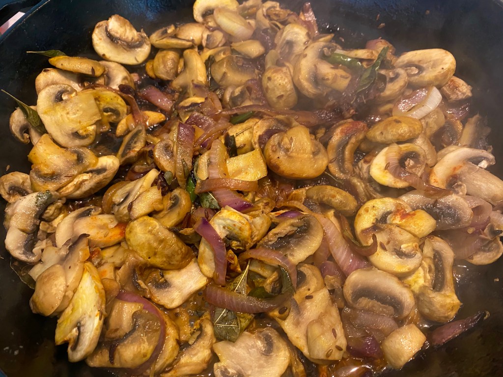 - Heat coconut oil. Temper with whole cumin seeds and curry leaves. Add in onion slices. Let it cook for a bit. Add in slit fresh chilies and then sliced mushrooms. Stir to combine.