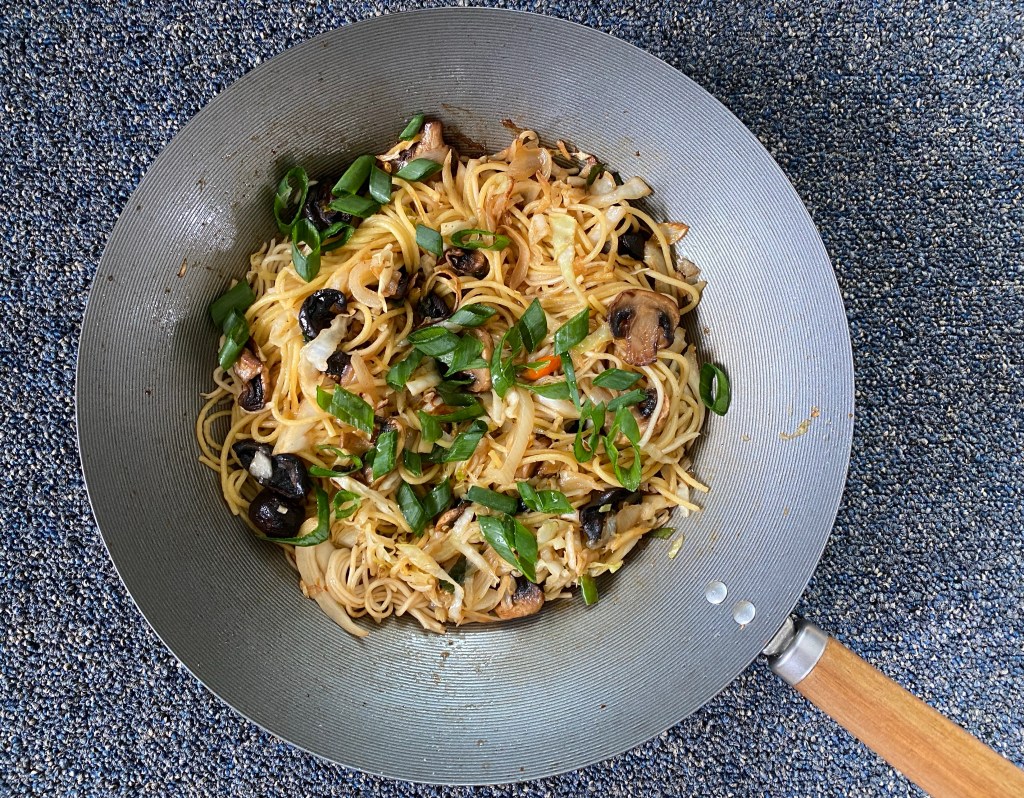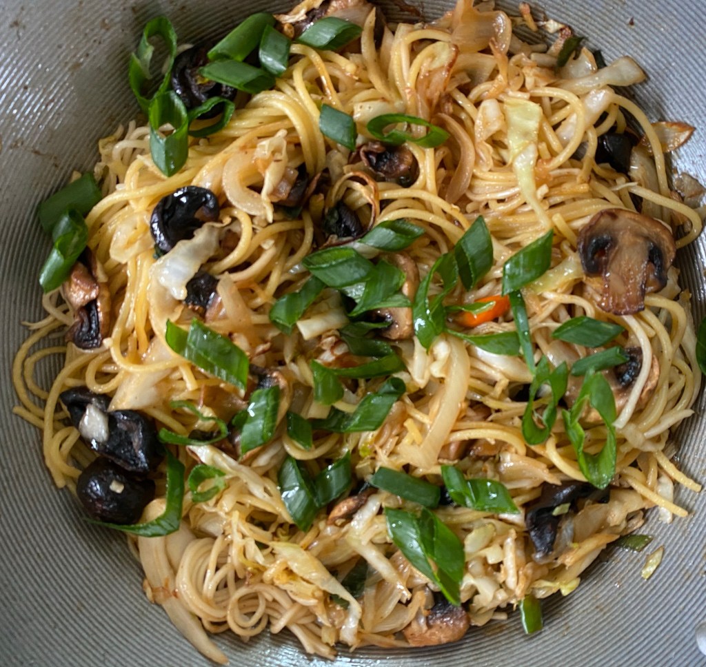 - Add the noodles. Stir to combine. Sprinkle the rest of the green onions. Serve.