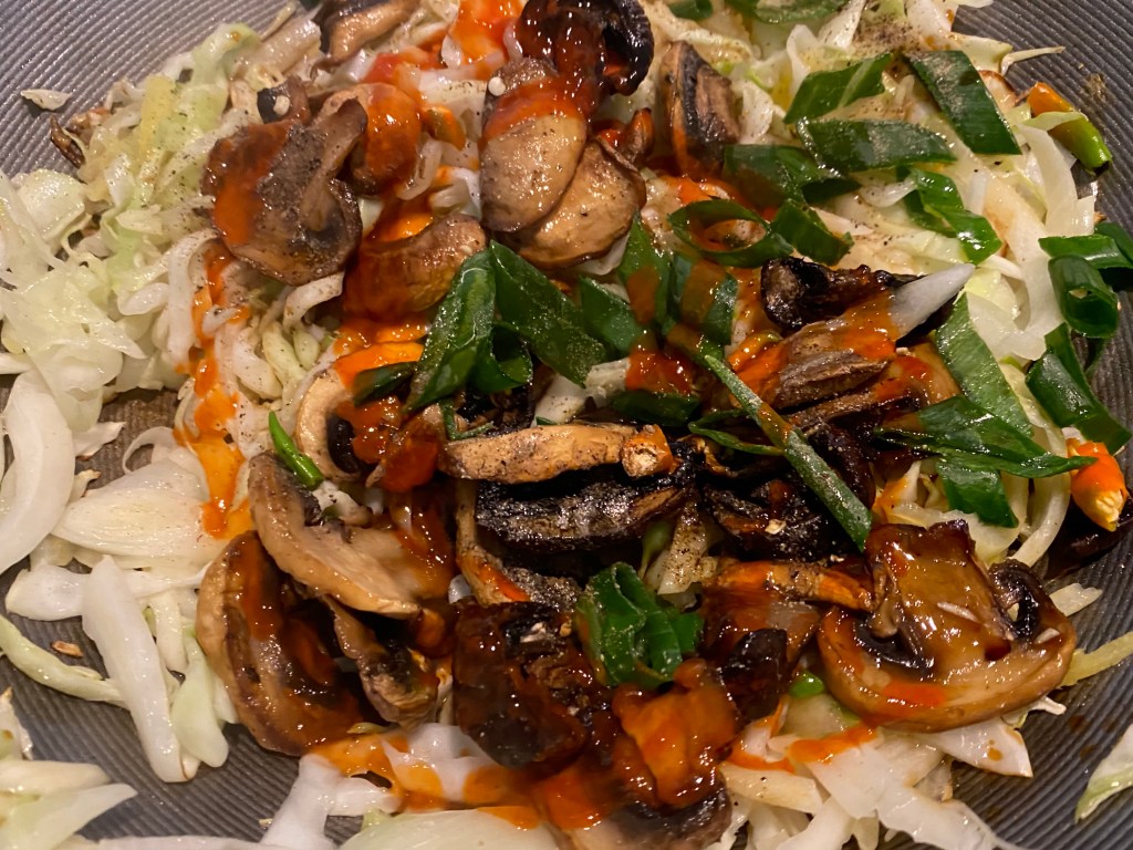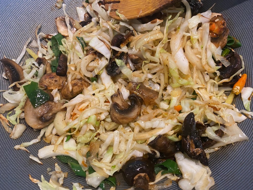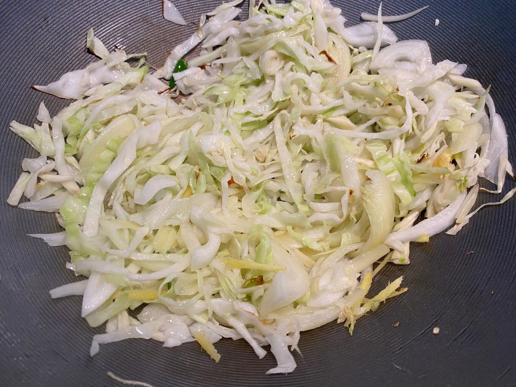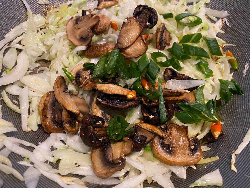- In the same wok add cabbage, onions, ginger and garlic. Toss fry on high heat. Add in sautéd mushrooms, half of the green onions and green chilies.