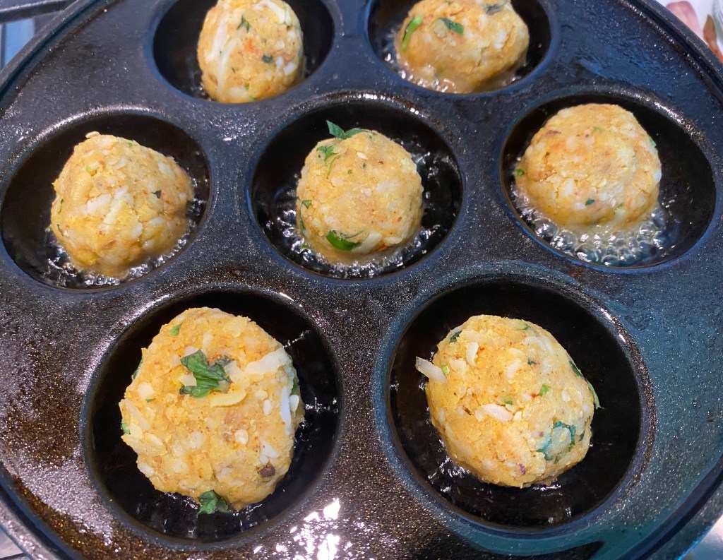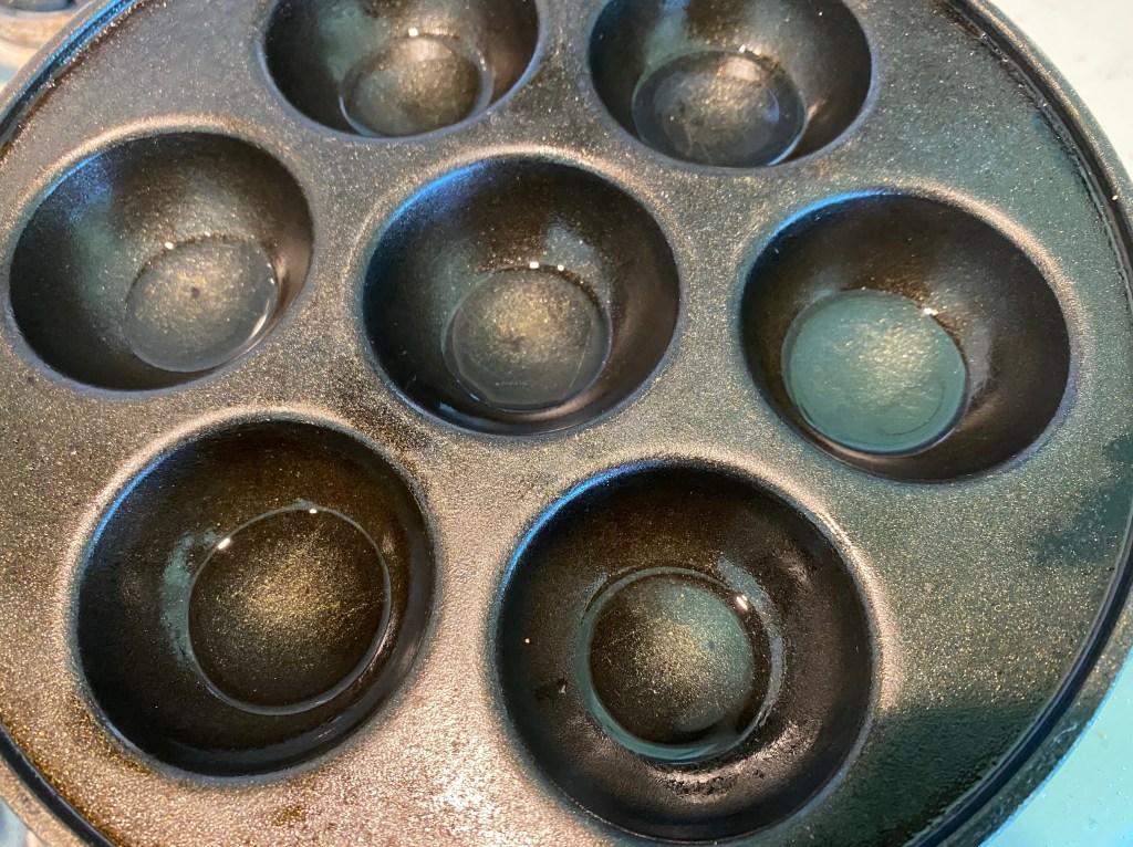 - Heat an appam pan on medium flame. Pour 1 tsp oil in each section. Lower a ball into each of the holes.