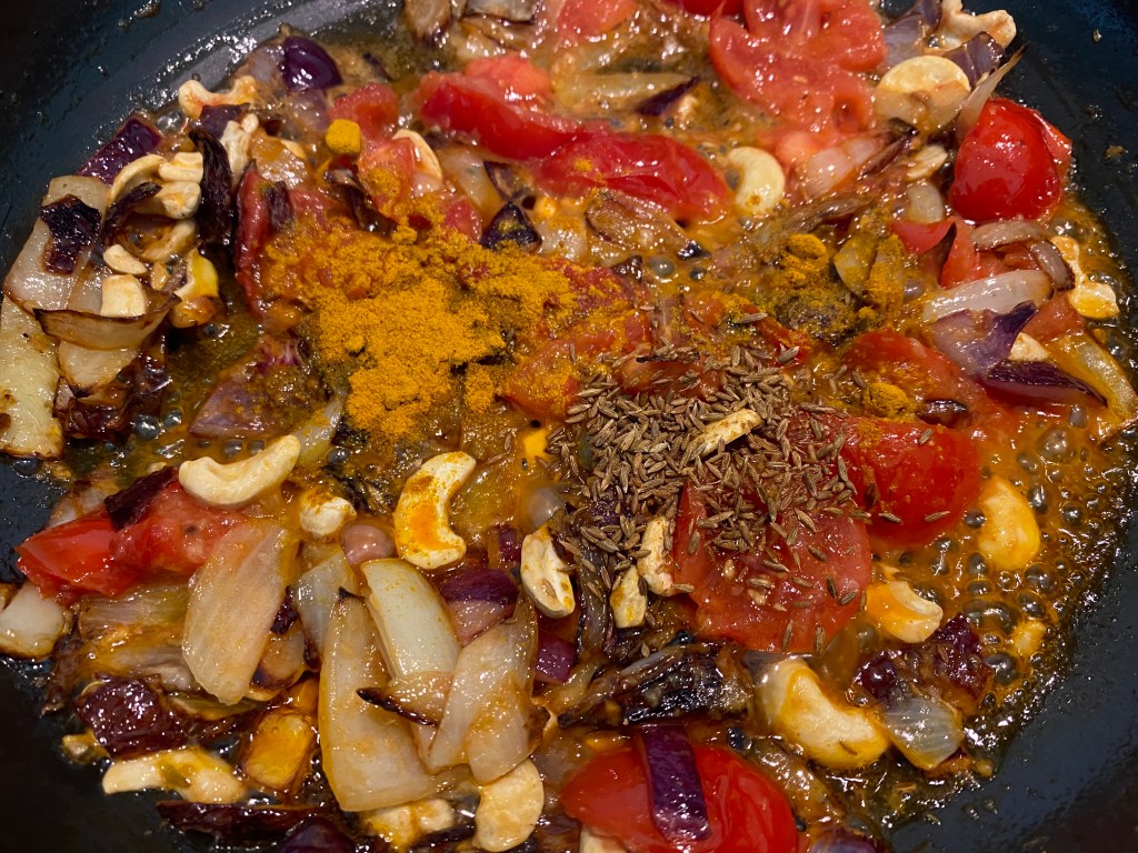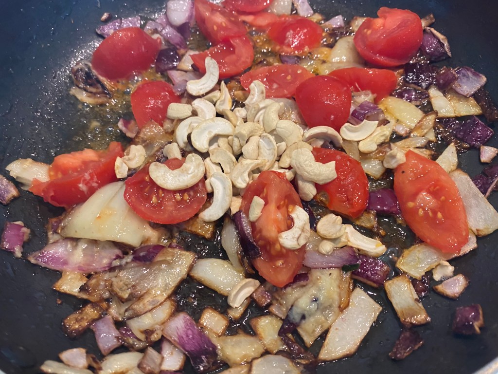 - In a large pan heat 2 tbsp of oil. Add in chopped onions. Let it turn translucent before adding ginger and garlic paste. Cook for a few seconds before adding tomatoes. Add in cashews.