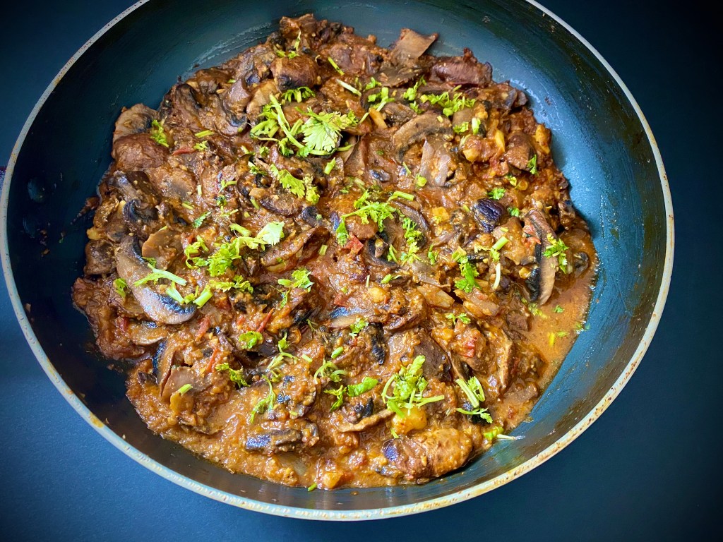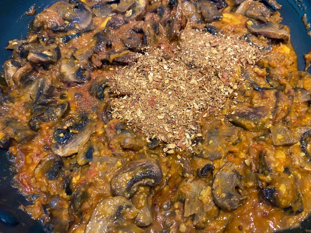 - Add in sautéd mushrooms. Crush kasuri methi in the palm of your hands and add it to the mushrooms. Next add the dry masala powder. Adjust seasoning. Cook for a few more minutes till the gravy comes to the required consistency.