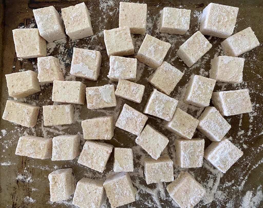- Drain tofu from its container. Wrap tofu in a kitchen towel and gently squeeze out all the water. Keep it wrapped for 10-15 mins till all the water is soaked up. Cut into thick cubes.
