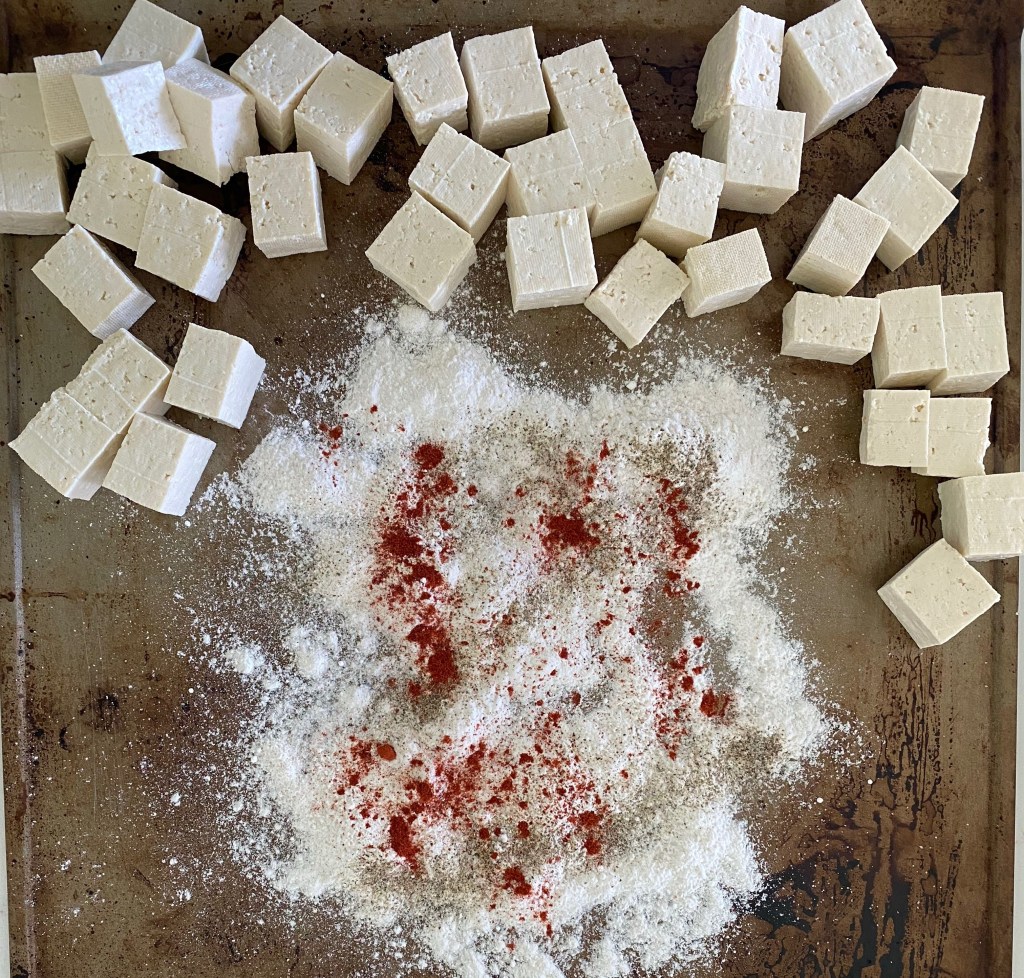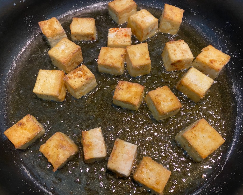 - In a tray season rice flour with salt, black pepper and paprika. Roll tofu cubes into the mixture. Let it sit for about 5 mins. Heat oil. Fry seasoned tofu cubes till golden brown on all sides. Do not crowd the pan. Cook in batches. Drain on kitchen towels. Keep aside.