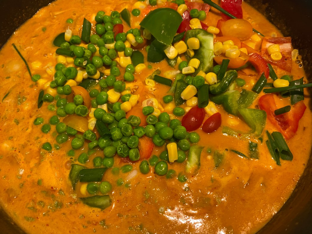 - Add coconut milk, fish sauce, water, peanut butter, salt and palm sugar. Let the curry come to a gentle boil. Put in lime zest. Next add in peas, sweetcorn, red pepper, tomatoes and green onions.