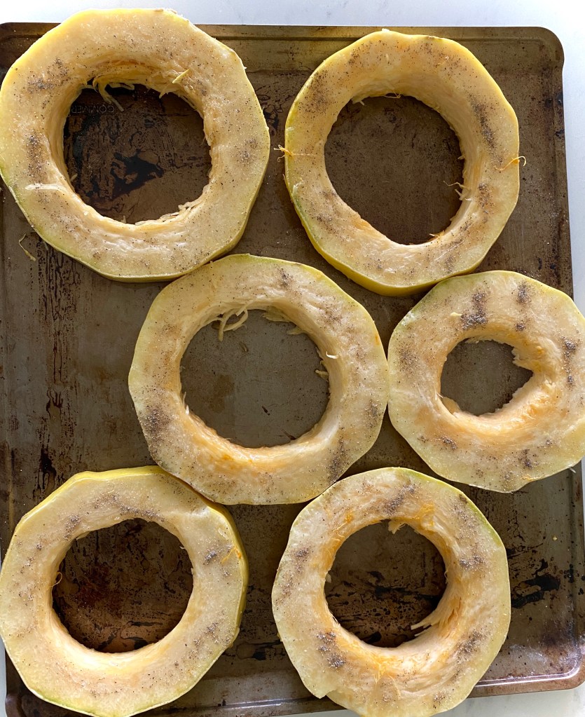 - Slice spaghetti squash into round rings scooping out the seeds. Reserve the seeds if you want to roast it. Place the rings on a greased baking tray. Drizzle olive oil on the squash rings. Rub salt and pepper.
