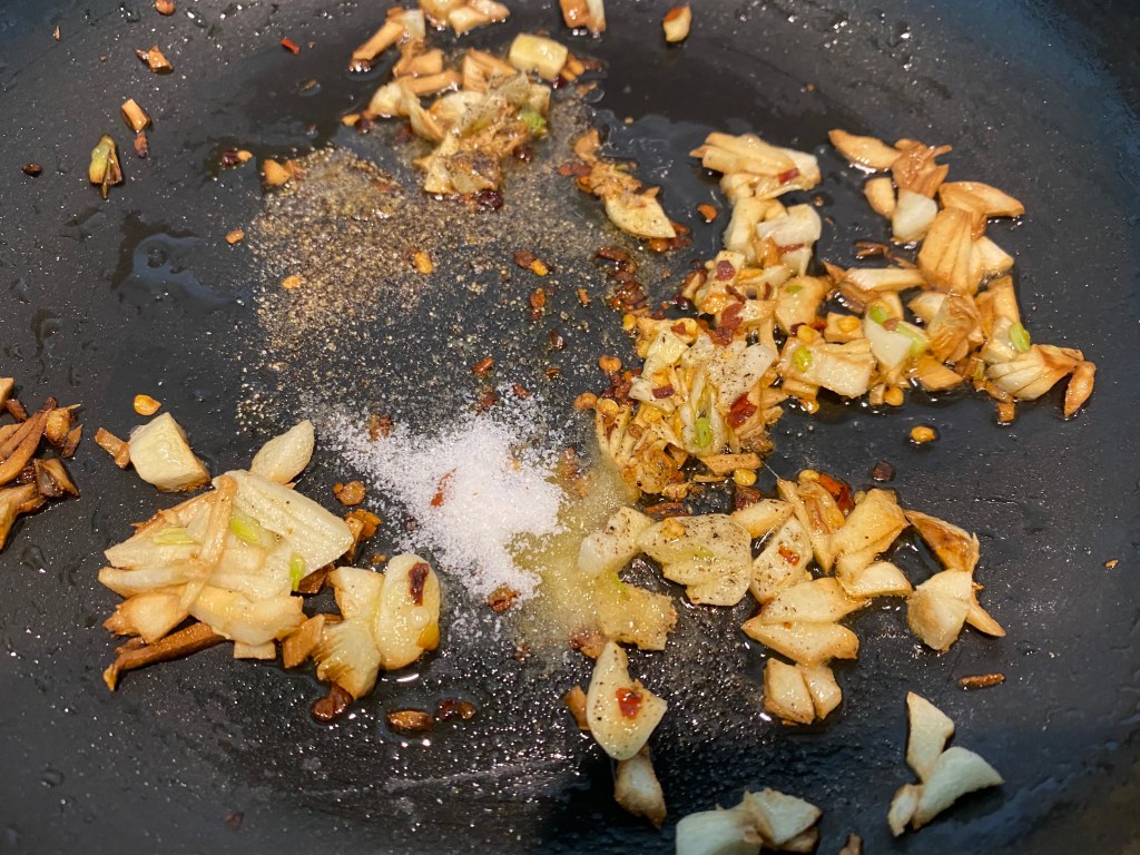 - Heat 2 tbsp olive oil. Sauté garlic pieces till golden. Add black pepper, salt and red pepper flakes. Add in canned chickpeas. Cook for a few minutes till the chickpeas become a bit toasted.