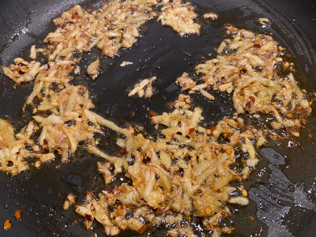 - In the same pan heat sesame oil. Sauté garlic, ginger and chili flakes. Let the garlic fry golden.