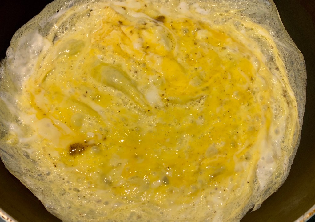 - Beat eggs in a bowl and season with salt and pepper. Heat a pan. Add 1 tsp sesame oil. Pour the eggs. Roll the pan around so the egg can spread out. Fry on a medium heat till done. Remove. Cut into strips.